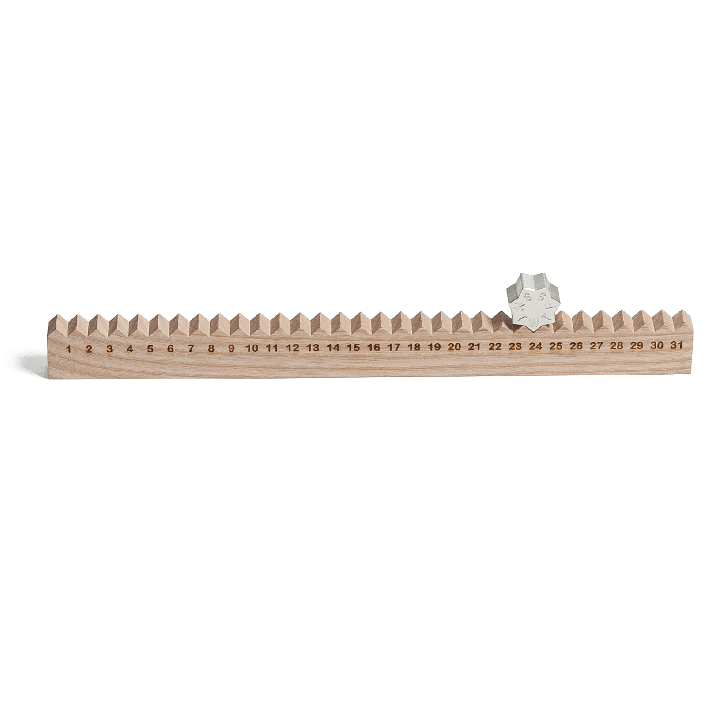 Monthly Measure ist ein immerwährender Kalender, entworfen von Sebastian Bergne. Die gezackte Holzleiste mit gravierten Zahlen von 1 bis 31 und der Metallstern mit den Anfangsbuchstaben der Wochentage zeigt dir Monat für Monat das aktuelle Datum – stilvoll und funktional zugleich.