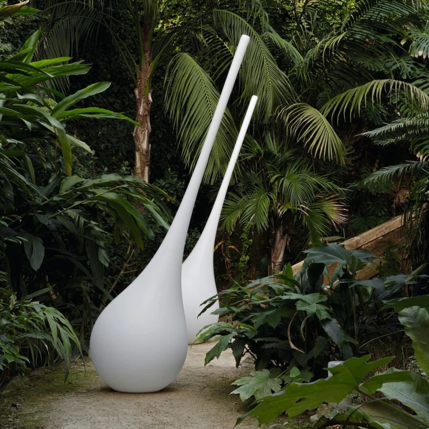 Mit ihrer schrägen Silhouette und der abgerundeten Unterseite erinnert diese leuchtende Vase an einen Wassertropfen. Ihre puristische und dynamische Form lenkt alle Aufmerksamkeit auf eine einzelne Blume, die aus dem langen dünnen Arm ragt. Trotz seiner Einfachheit strahlt die Ampoule eine elegante Präsenz aus und macht überall Eindruck.