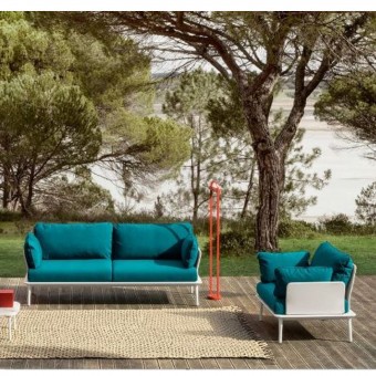 Reva ist eine Outdoor-Kollektion, die sich durch weiche Linien und großzügige Abmessungen auszeichnet. Dreisitzer-Sofa mit dünnem Rahmen aus druckgussgepresstem Aluminium mit vier sich verjüngenden Beinen aus druckgussgepresstem Aluminium, die das klare Design unterstreichen. Kissen aus gedrucktem Polyurethanschaum, mit wasserdichtem Stoff bezogen