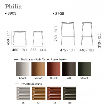 Philía hebt sich durch seine robuste Stahlrohrstruktur mit 20 mm Durchmesser und den Ausführungen für den Außenbereich hervor, während Sitz und Rückenlehne aus einem extrudierten PVC-Gewebe mit Nylonkern mit geprägter Oberfläche geflochten sind, das horizontal verwebt ist, um eine zentrale Überkreuzung zu schaffen, die Elastizität und Stärke garantiert.