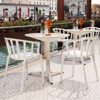 Venice, der Designerstuhl von Philippe Starck zu Ehren der Stadt Venedig, eine Homage an den Besitzer seiner dortigen Lieblingsbar, ist ein kompakter Armlehnstuhl, der in der Form an einen klassischen Korbstuhl erinnert, in seiner Funktionalität jedoch weit darüber hinaus geht.