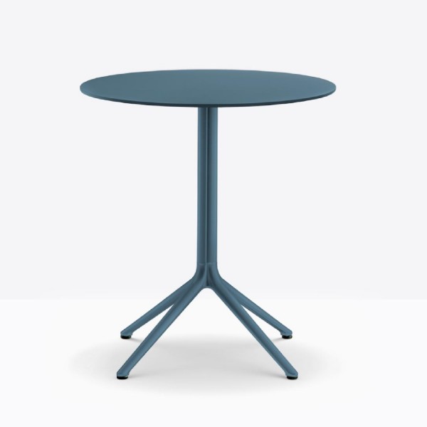 Tisch mit Säule aus extrudiertem Aluminium der sich unten in vier Auslegern aus Aluminium-Druckguss auftrennt .