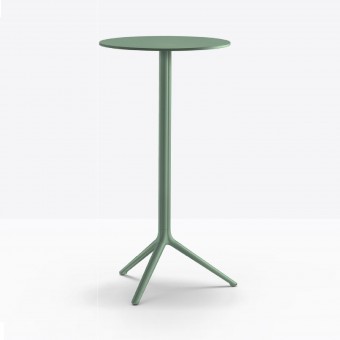 Stehtisch mit Säule aus extrudiertem Aluminium der sich unten in drei Auslegern aus Aluminium-Druckguss auftrennt .