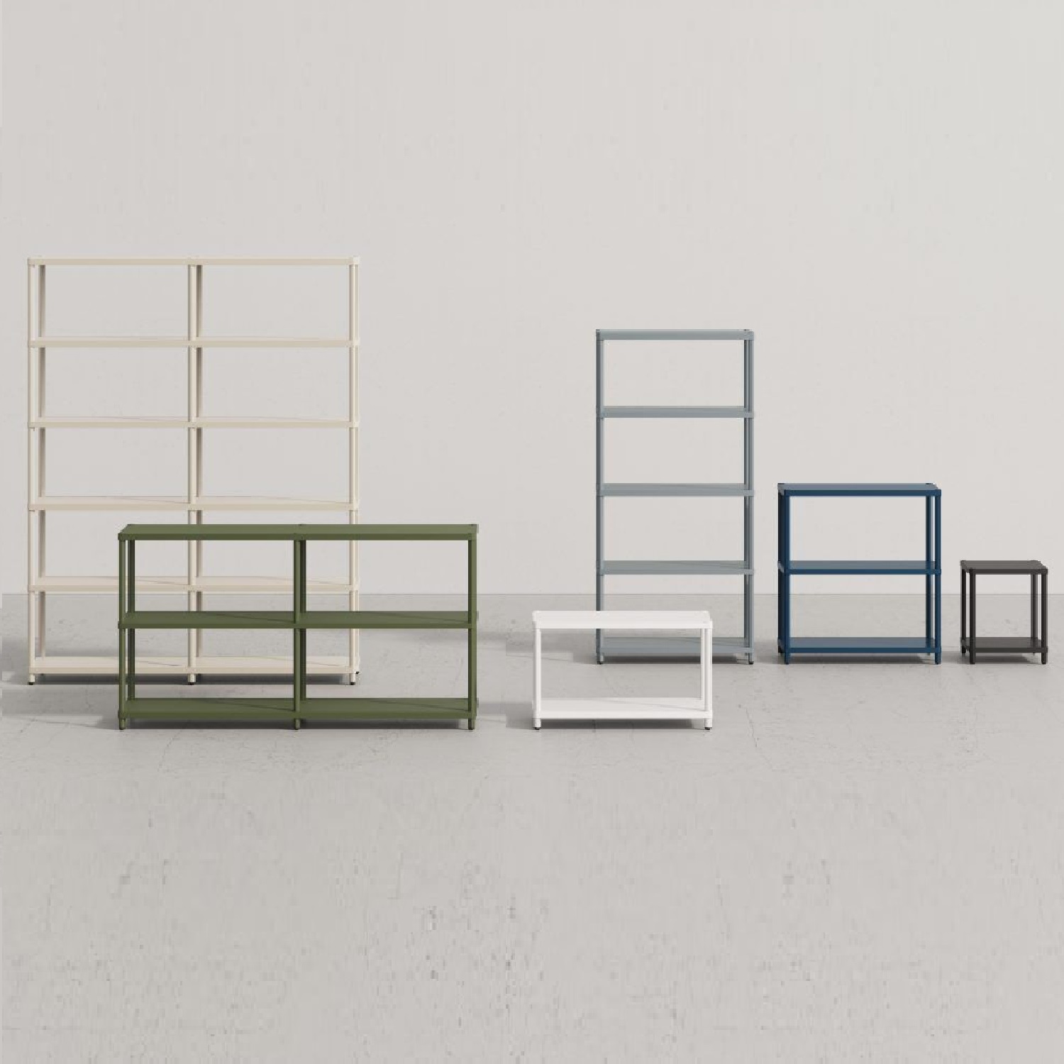 Die Regale der Serie Stilt wurden entworfen, um die Organisation des Raums zu erleichtern. Sie eignen sich gut für Büro-, Hotel- und auch Wohneinrichtung. Die kompakte Form hilft, diese Möbel auch in kleineren Räumen zu platzieren. Einer der Hauptvorteile der Stilt-Regale ist ihre Modularität, mit der Sie jede Konfiguration erstellen können, die den Anforderungen des Benutzers entspricht. Ein Metallgestell in matten Farbtönen in Verbindung mit Fachböden aus Melamin bilden ein stilistisch zusammenhängendes Ganzes. Die Farboptionen des Gestells und der Fachböden bilden die monochromen Konfigurationen.