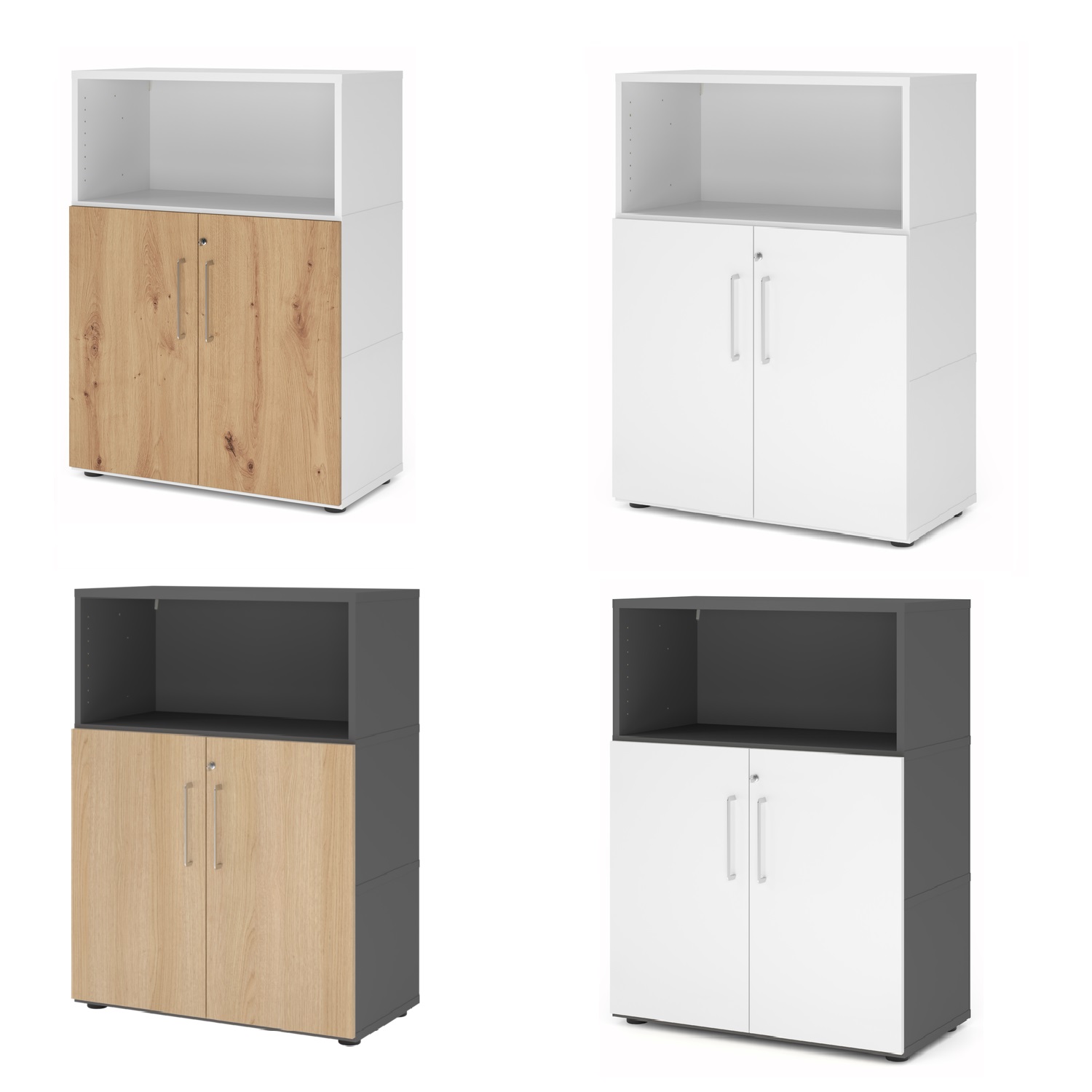 - Grund- und Aufsatzkorpus mit 8 mm Sichtrückwand in den Dekoren: Graphit, Weiß