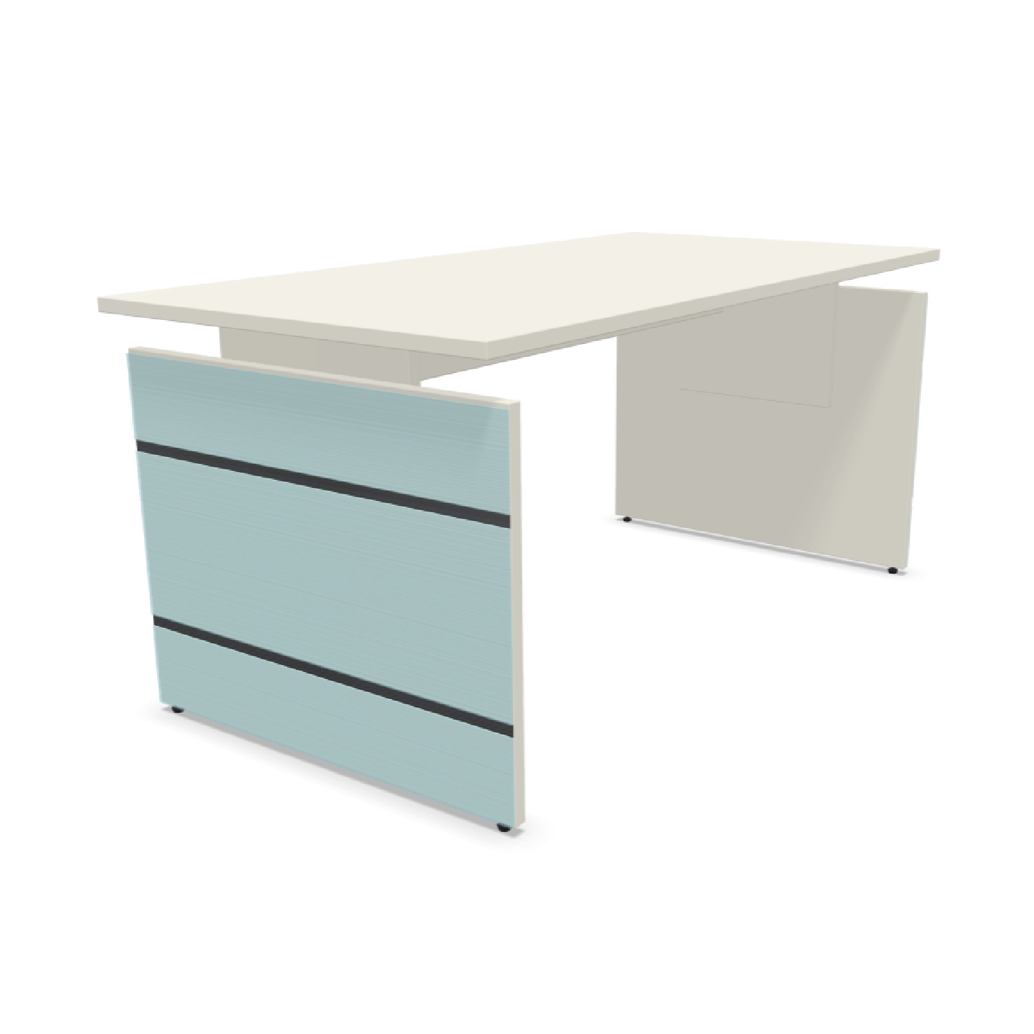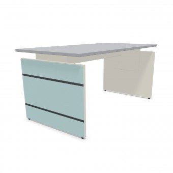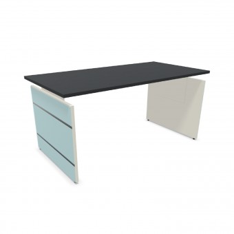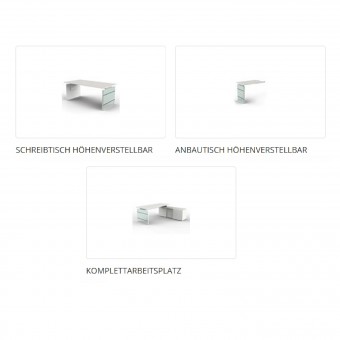 Sämtliche Tische sind höhenverstellbar. Wangen-Gestell aus Holz. Die Wangen sind mit ESG-Glas (rückseitig weiß lackiert) belegt mit Edelstahlstreifen versehen. Die Tischplatten sind pflegeleicht und strapazierfähig durch Melaminharz-Beschichtung. Unter der Platte befindet sich ein Kabelkanal zur Aufnahme von Steckdosen(leisten) etc.