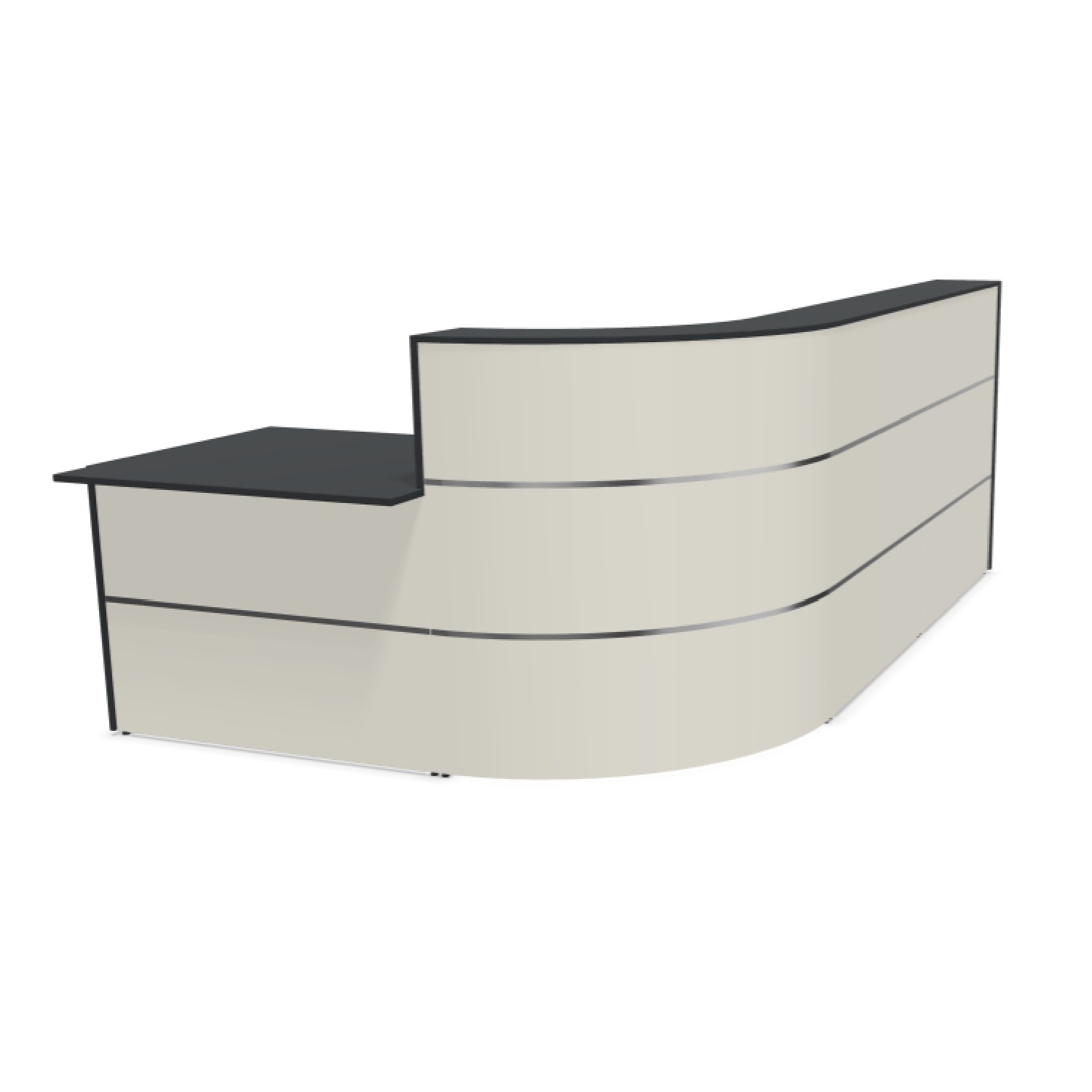 Für die Kabelführung gibt es Durchlässe in den Arbeitsplatten. Der Theken-Metallkörper ist mit dekorativen Edelstahlstreifen bestückt