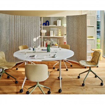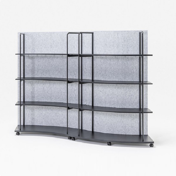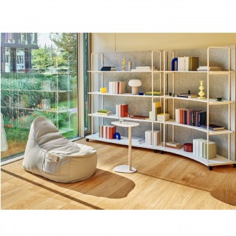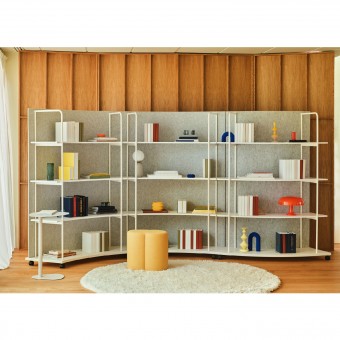 Das vom Yonoh Studio entworfene Regal eignet sich sowohl als Einzelregal an der Wand als auch in einer Konfiguration aus mehreren Modulen. Die leichte Konstruktion, die mit Rollen ausgestattet ist, lässt sich leicht bewegen, so dass man den Raum schnell umgestalten und halbprivate Zonen mit organischen Formen schaffen kann. Ein ungewöhnliches Element des Tanca-Regals ist die PET-Rückwand, die die Module optisch abschließt und die akustischen Bedingungen im Raum verbessert.