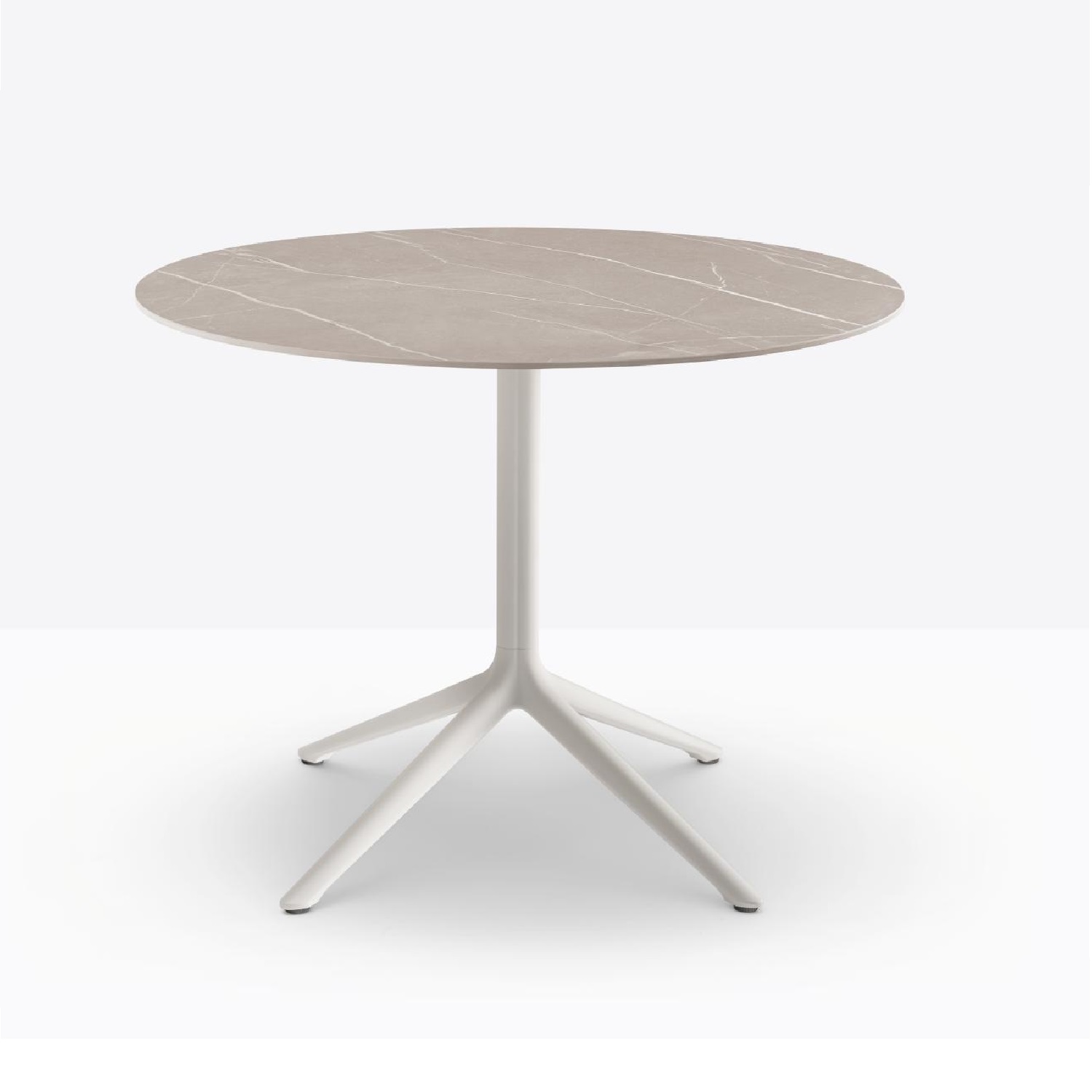 Tisch mit Säule aus extrudiertem Aluminium der sich unten in vier Auslegern aus Aluminium-Druckguss auftrennt .