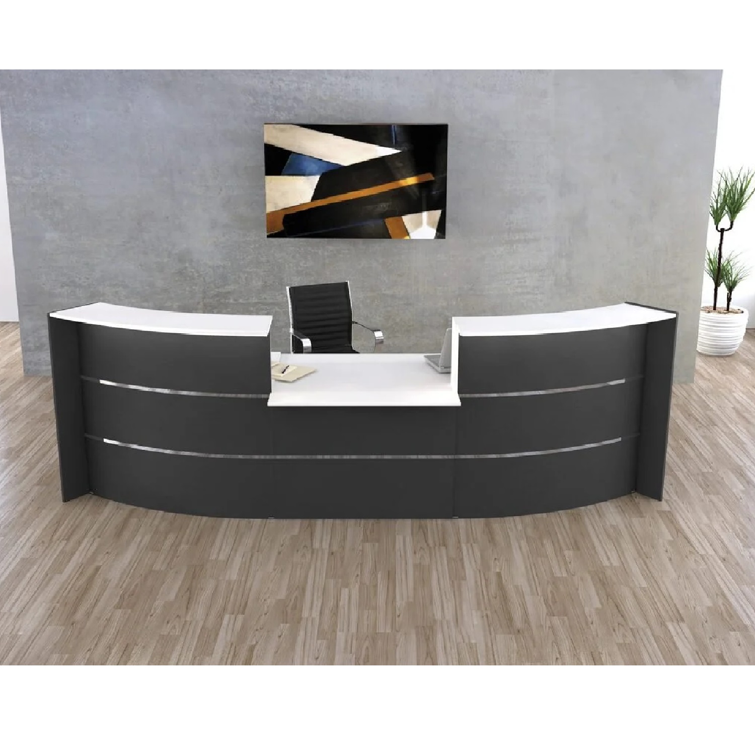 Die Holzplatten der Theke sind mit Melaminharz beschichtet und mit stoßfesten ABS-Kanten versehen. Die Arbeitsplattentiefe beträgt 80 cm. Für die Kabelführung gibt es Durchlässe in der Arbeitsplatte. Die Thekenfront ist mit dekorativen Edelstahlstreifen bestückt.