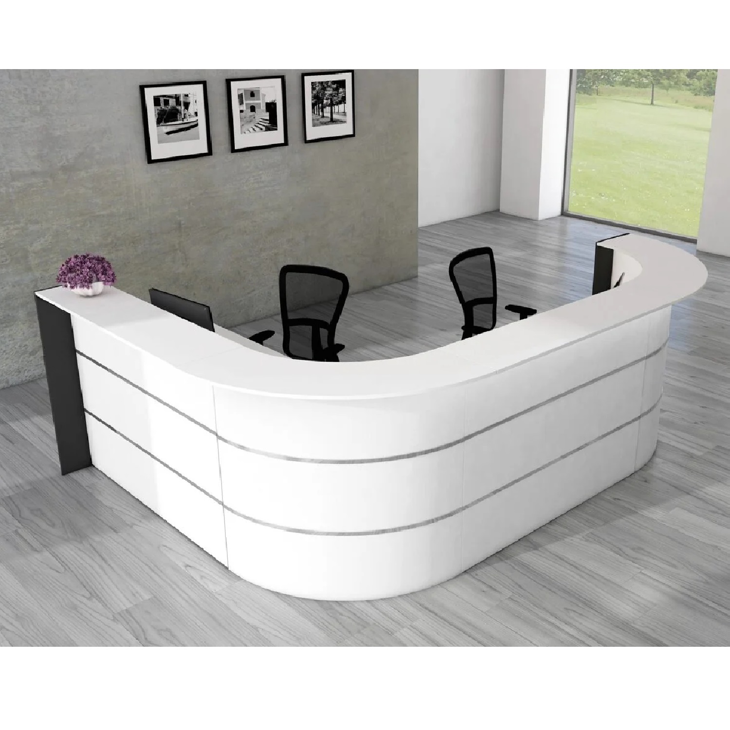 Die Holzplatten der Theke sind mit Melaminharz beschichtet und mit stoßfesten ABS-Kanten versehen. Die Arbeitsplattentiefe beträgt 80 cm. Für die Kabelführung gibt es Durchlässe in der Arbeitsplatte. Die Thekenfront ist mit dekorativen Edelstahlstreifen bestückt.