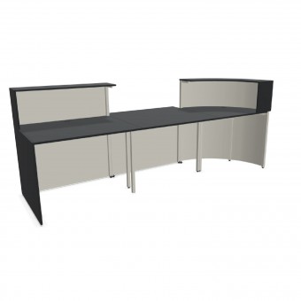 bestehend aus einem Theken-Eckelement im 90 Grad Winkel, einem Tischelement und einem geraden Theken-Element. Tischplatte / Gestell / Frontplatte
