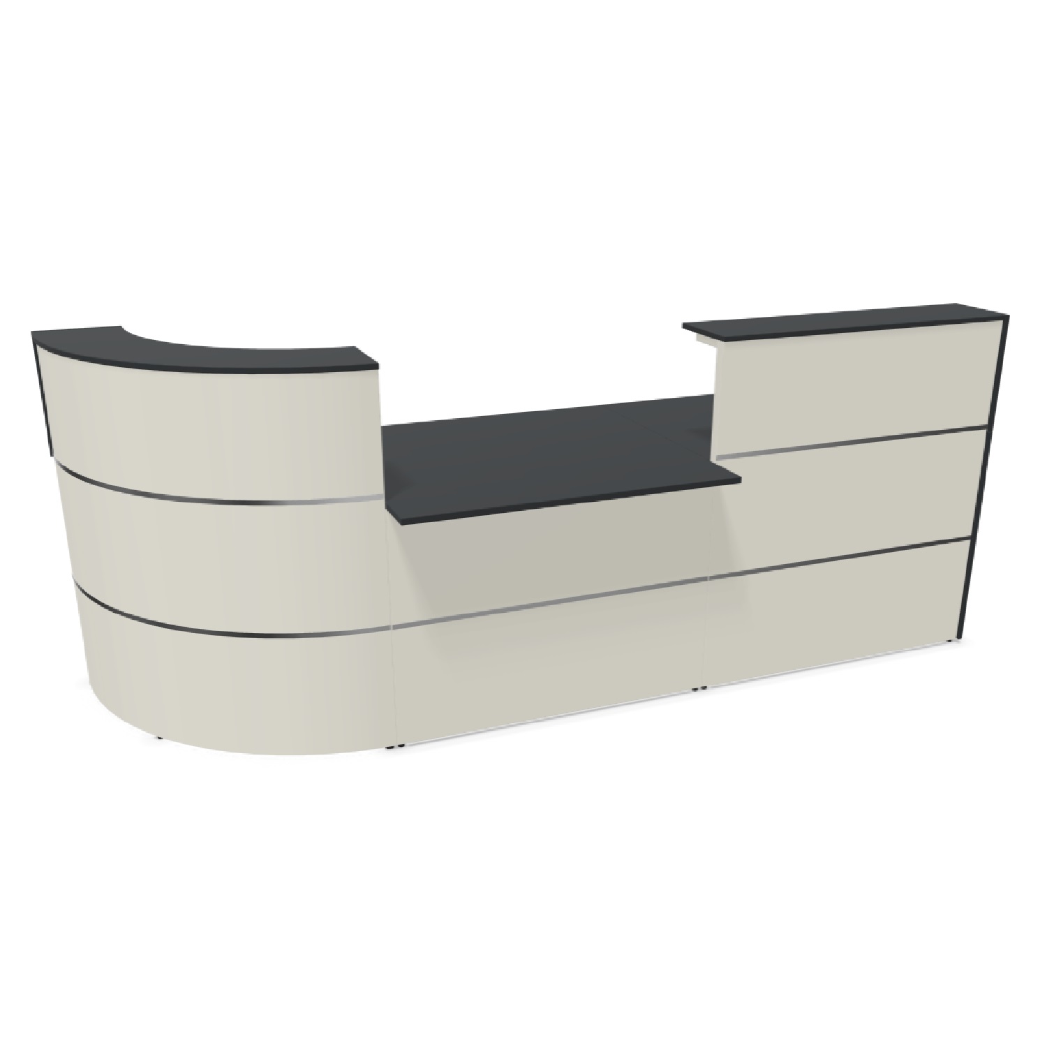 Für die Kabelführung gibt es Durchlässe in den Arbeitsplatten. Der Theken-Metallkörper ist mit dekorativen Edelstahlstreifen bestückt