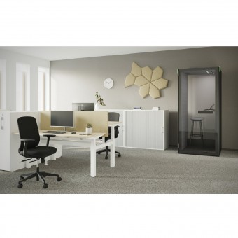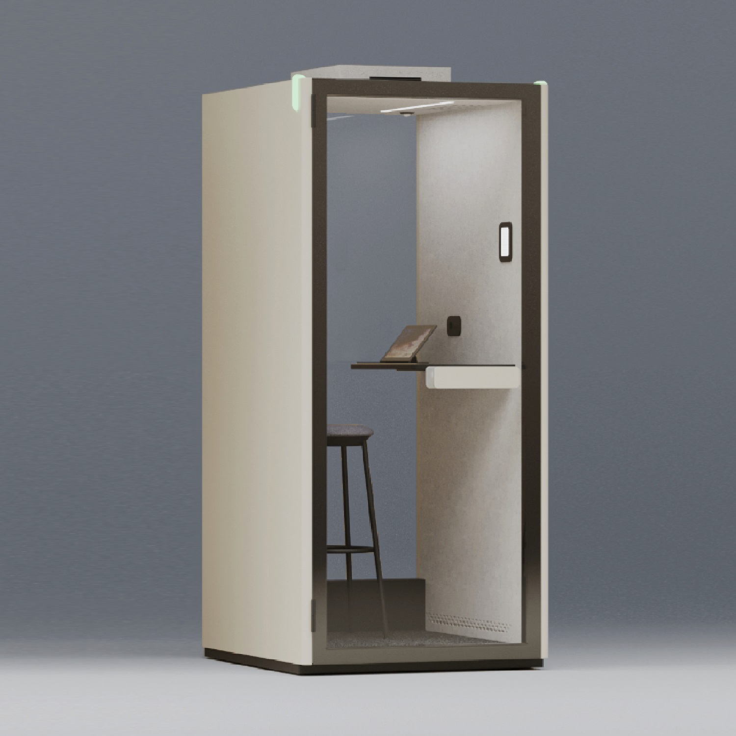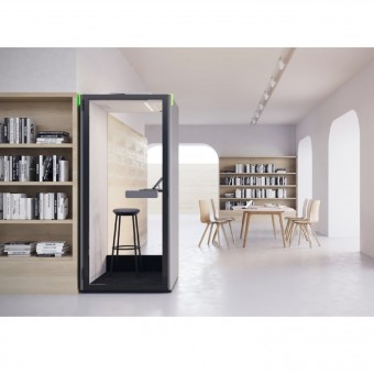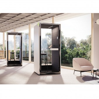 LED-Beleuchtung und ein Belüftungssystem sorgen für ein angenehmes Arbeits- und Besprechungsumfeld. Die Einstellung der Lichtintensität und die gefilterte Belüftung sorgen für eine angenehme Atmosphäre, die über ein intuitives Touchpanel einfach gesteuert werden kann. Die Systeme werden beim Betreten des Pods automatisch aktiviert und schalten sich fünf Minuten nach Verlassen aus, um Energie zu sparen.