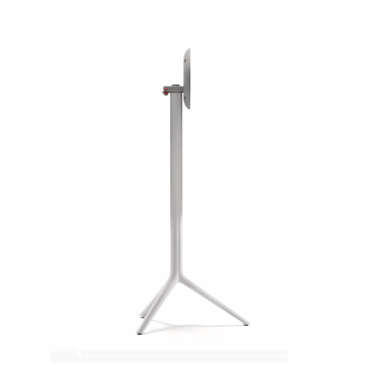 Stehtischgestell mit klappbarer Tischplattenhalterung und Säule aus extrudiertem Aluminium der sich unten in drei Auslegern aus Aluminium-Druckguss auftrennt .