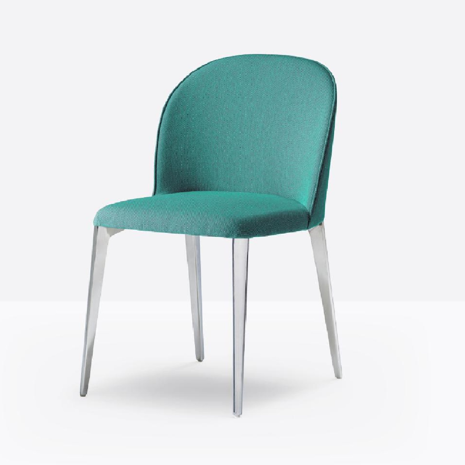Stilistische Schlichtheit bestimmt die Kollektion Laja 2, die sich durch weiche, umhüllende Linien auszeichnet. Stuhl mit Sitz aus Polyurethanschaum mit elastischen Gurten, flexibler und einladender Rückenlehne und Beinen aus druckgegossenem Aluminium. Die breite Farbpalette an Stoffen und Bezügen ermöglicht monochromatische oder bichromatische Kombinationen zwischen Innen- und Außenseite der Schale.