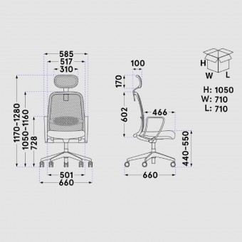 • Vertikal verstellbare Kopfstütze (nach oben und unten), damit Sie Ihren Kopf während der Arbeit bequem anlehnen können; ihre Montage erfordert keine Schrauben oder Beschläge;