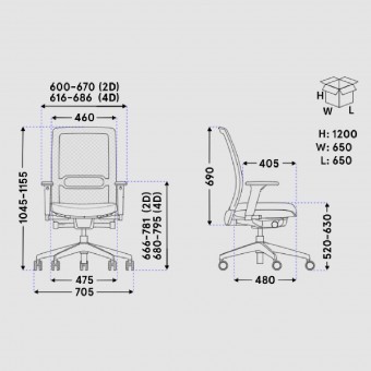 - Auto Synchro: 4 Positionen der Blockierung der Rückenlehne, Neige der Rückenlehne bis zu 20° und des Sitzes 4°;