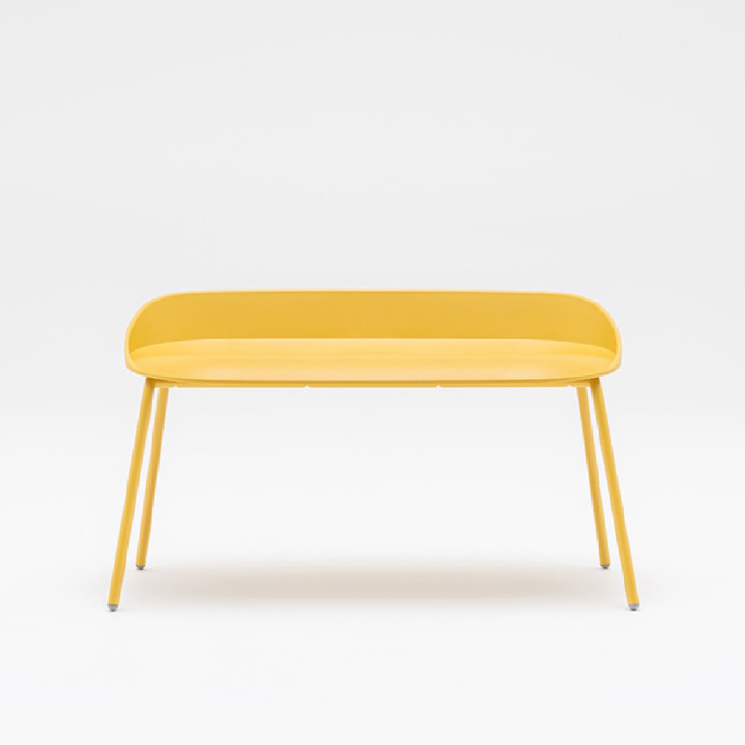 Die Kunststoffbänke wurden von Dirk Winkel entworfen. Die minimalistische Form fügt sich in verschiedene Inneneinrichtungen, Einrichtungsstilen und Raumfunktionen ein. Die doppelte Sitzbreite spart Platz um den Tisch und die niedrige integrierte Rückenlehne ermöglicht eine bequeme Sitzposition. Die Farben des Gestells und Sitzes können unabhängig voneinander aus einer Reihe intensiver Farbtöne ausgewählt werden. Team Bank kann Außenräume, Balkons und Gärten ausstatten, aber auch Warteräume, Restaurants und andere Räumlichkeiten, Büros und Häuser.