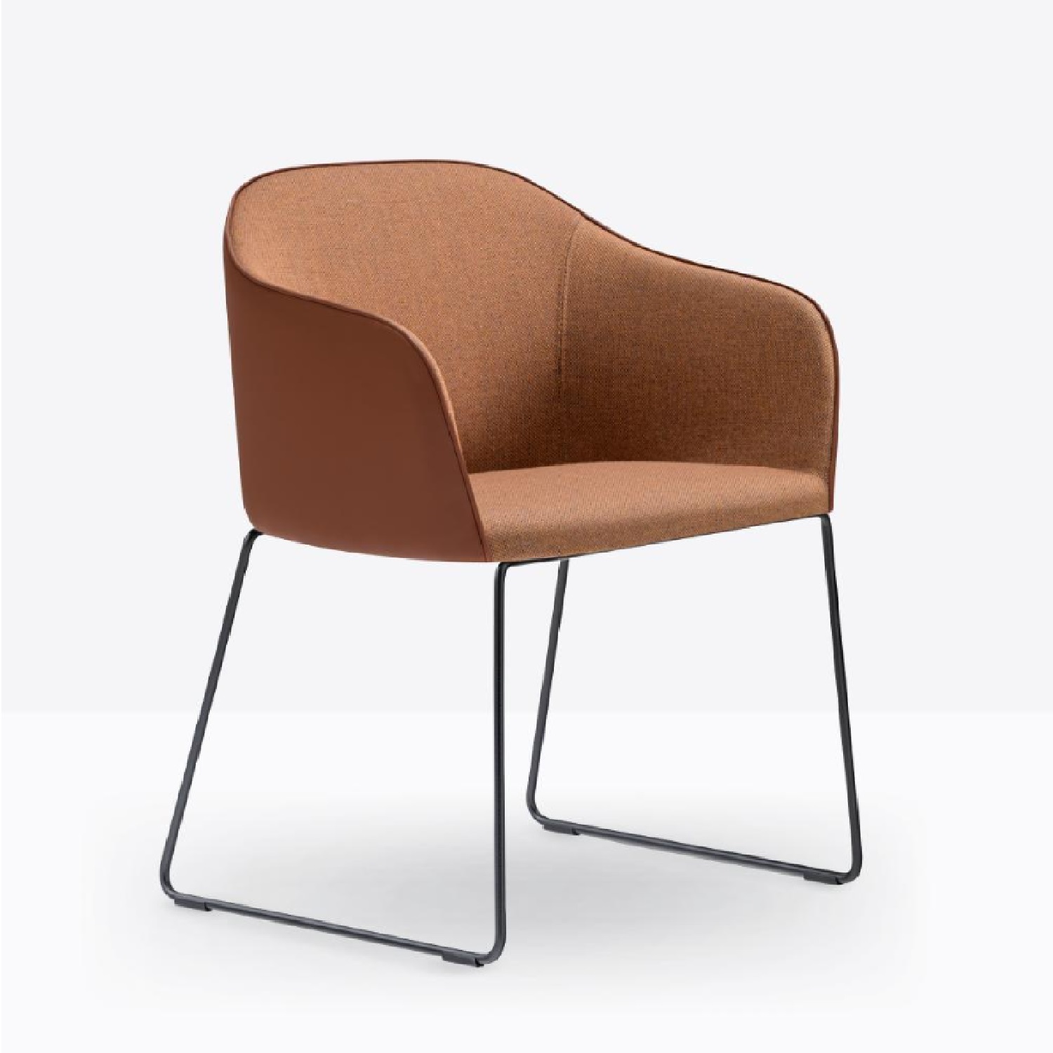 Stilistische Schlichtheit bestimmt die Kollektion Laja 2, die sich durch weiche, umhüllende Linien auszeichnet. Armlehnstuhl mit Sitz aus Polyurethanschaum mit elastischen Gurten, flexibler und einladender Rückenlehne und schlittenbeine aus Kufen-Gestell aus Stahl. Die breite Farbpalette an Stoffen und Bezügen ermöglicht monochromatische oder bichromatische Kombinationen zwischen Innen- und Außenseite der Schale.