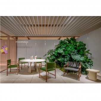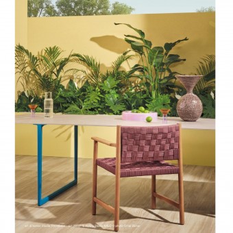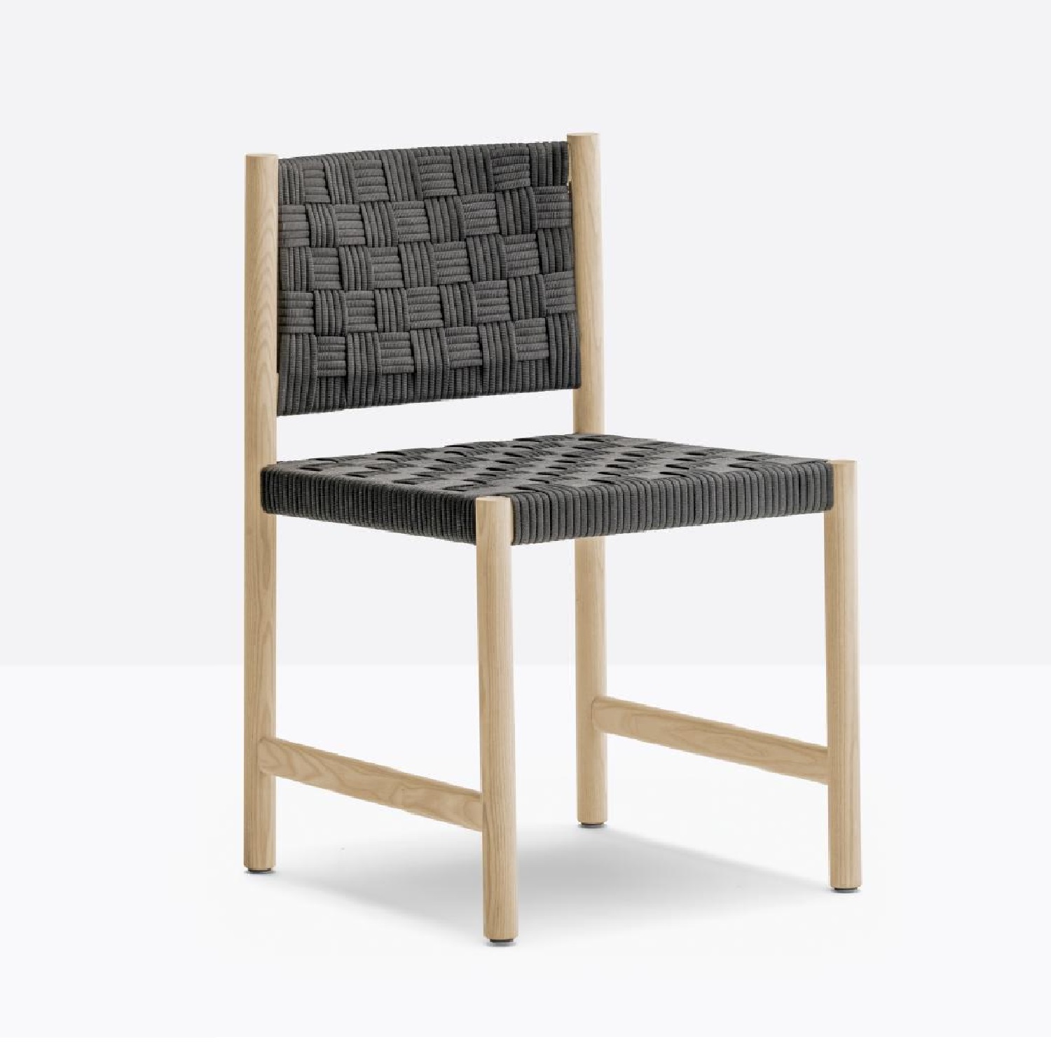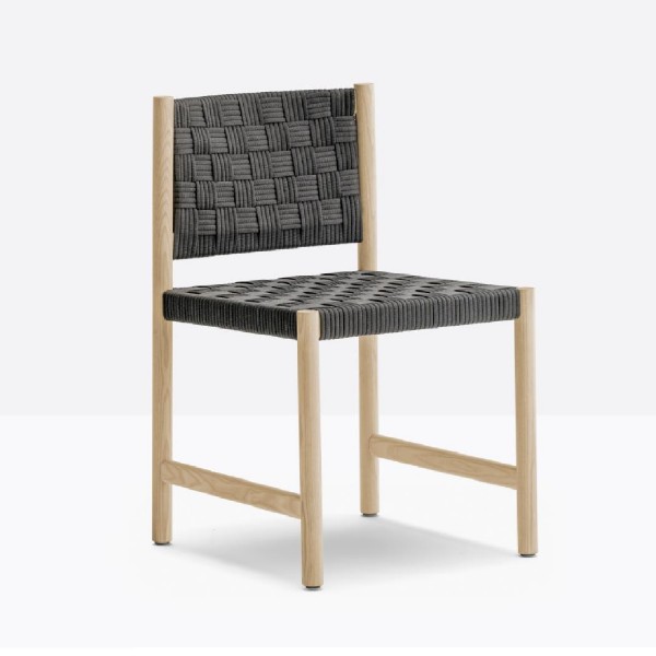 Griante interpretiert die Idee des geflochtenen Sitzmöbels neu – mit einem Design, das handwerkliche Tradition und industrielle Fertigung vereint. Indoor Stuhl mit Struktur aus massivem FSC® C114358 zertifiziertem Eschenholz. Die zylindrischen Beine sind gedrechselt, während die Aluminiumstruktur für Stabilität und Halt der Sitzfläche sorgt. Charakteristisches Merkmal ist die in Italien von Hand gefertigte Flechtung von Sitzfläche und Rückenlehne. Sie besteht aus einem Band aus Polypropylengarn mit dreidimensionaler Textur, das nicht nur Komfort und Witterungsbeständigkeit garantiert, sondern auch vollständig recycelbar und zerlegbar ist. Die Flechtarbeit zeichnet sich durch das wiederholte Spiel mit der Geometrie des Quadrats aus – ein Motiv, das sich auch in den großzügigen Proportionen der Sitzfläche widerspiegelt und dem Stuhl ein elegantes, raffiniertes und zugleich einladendes Aussehen verleiht.