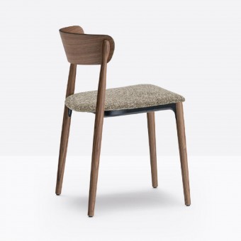 Stuhl mit gepolsterter Sitzfläche aus Polyurethanschaum, Rückenlehne aus Multiplex und mit Beinen aus massivem Eschenholz oder amerikanischem Nussbaum und Struktur aus druckgegossenem Aluminium.
