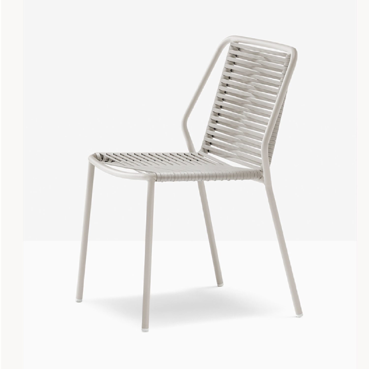 Philía hebt sich durch seine robuste Stahlrohrstruktur mit 20 mm Durchmesser und den Ausführungen für den Außenbereich hervor, während Sitz und Rückenlehne aus einem extrudierten PVC-Gewebe mit Nylonkern mit geprägter Oberfläche geflochten sind, das horizontal verwebt ist, um eine zentrale Überkreuzung zu schaffen, die Elastizität und Stärke garantiert.
