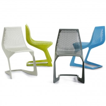 Der fließfähige Kunststoff Ultradur® High Speed ermöglichte die Konzeption des Stuhls als Monoblock Spritzguss in dessen tragender Rahmenkonstruktion die netzartige Sitz- und Rückenfläche Myto das für Freischwinger typische Sitzgefühl verleiht.