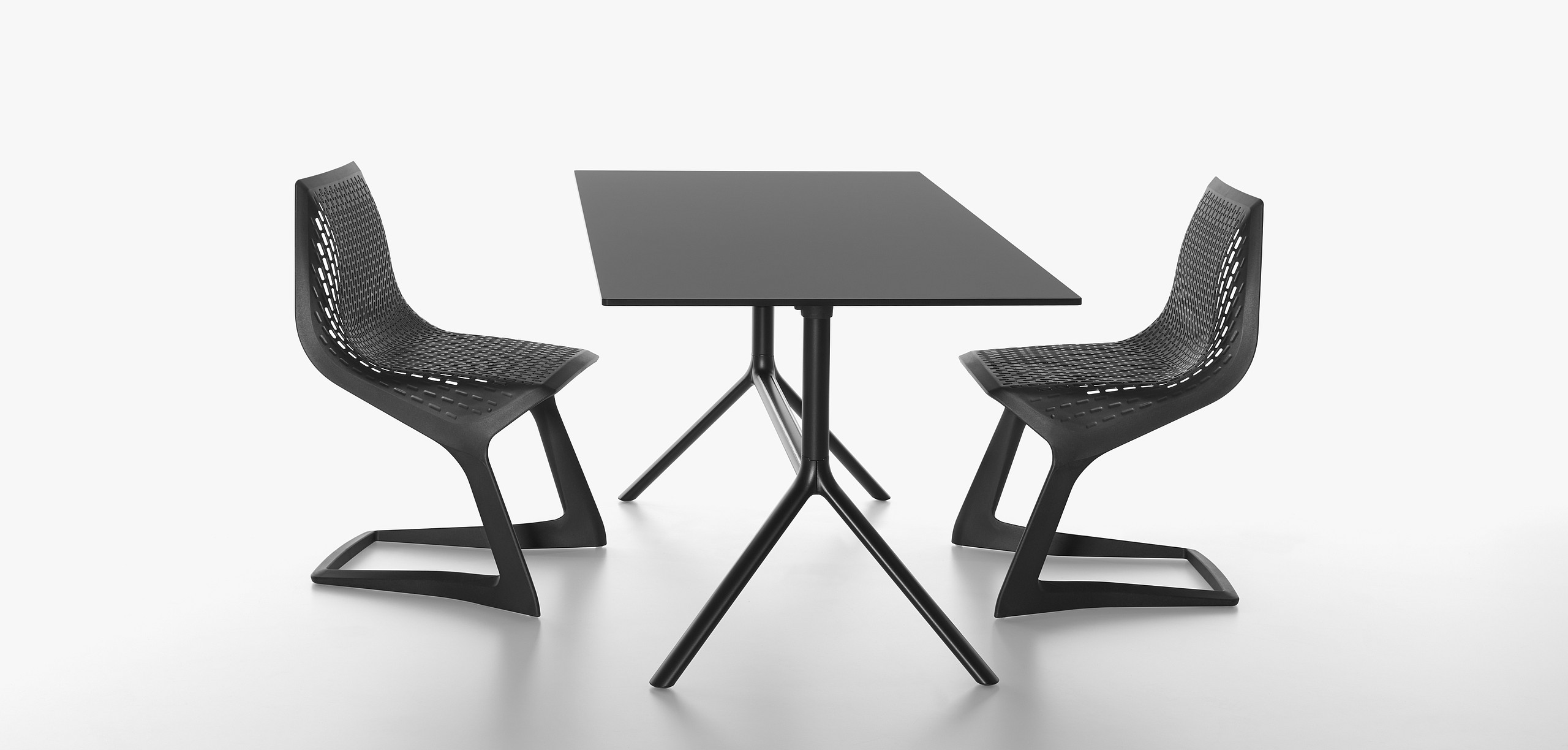 Der fließfähige Kunststoff Ultradur® High Speed ermöglichte die Konzeption des Stuhls als Monoblock Spritzguss in dessen tragender Rahmenkonstruktion die netzartige Sitz- und Rückenfläche Myto das für Freischwinger typische Sitzgefühl verleiht.